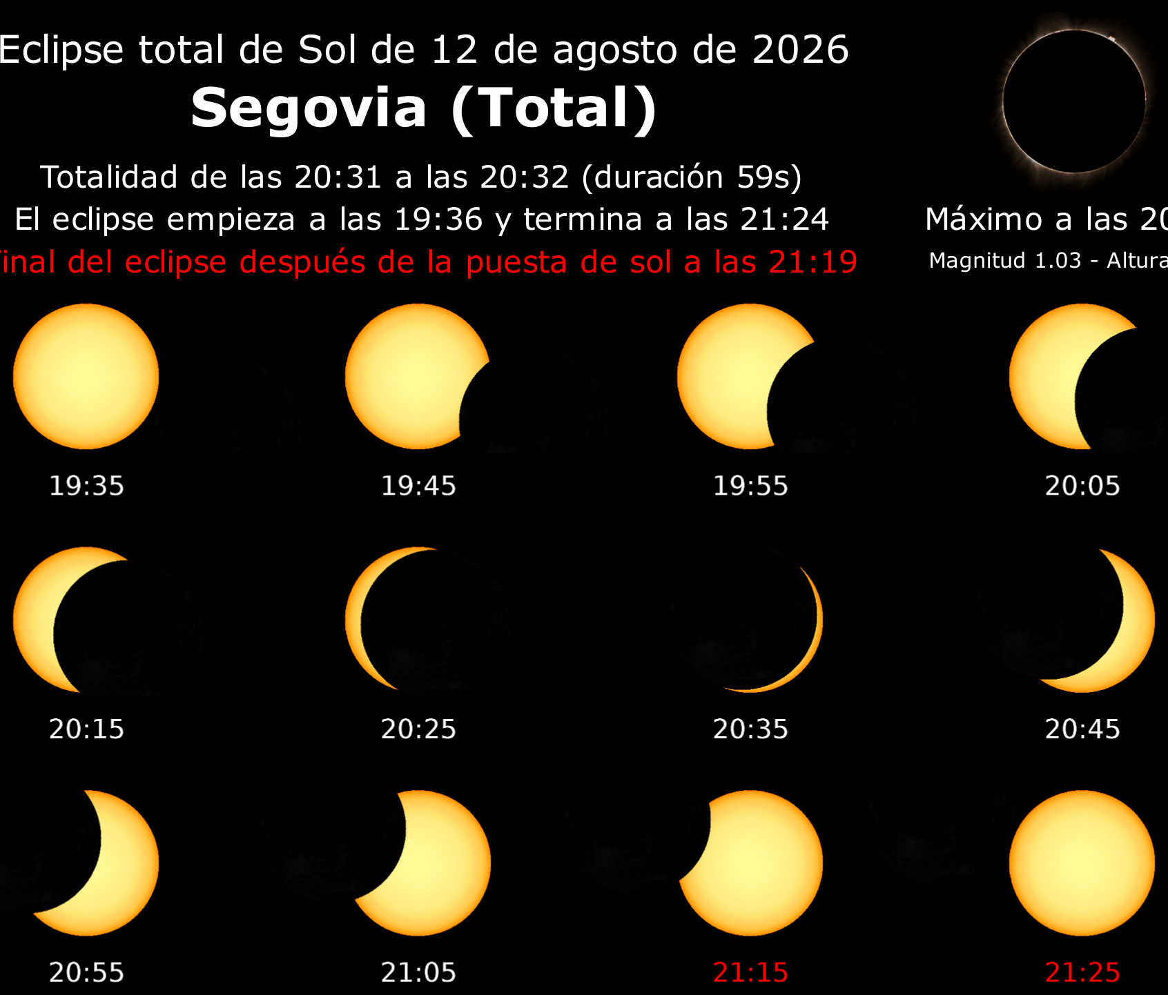 El próximo 12 de agosto de este recién estrenado 2026 se producirá un eclipse solar total que podrá verse desde la península Ibérica, algo que no pasaba desde 1912. “Es una oportunidad única, un regalo cósmico poder ver esta maravilla de la naturaleza. Segovia será un lugar privilegiado para observar un eclipse solar total al atardecer. La totalidad comenzará alrededor de las 20:30-20:31, con una duración breve, siendo uno de los mejores puntos de España para ver el fenómeno, que coincidirá con el sol muy bajo en el horizonte. La provincia de Segovia se encuentra en la franja de totalidad, lo que significa que el Sol será cubierto por completo por la Luna. Es recomendable usar gafas de eclipse homologadas, excepto durante los breves segundos de la fase de totalidad.